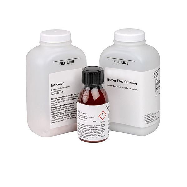 The reagent set includes powdered components that are mixed to create two liquid reagent solutions used in the analyzer’s automated measurement cycle. This chemistry enables precise, repeatable free chlorine readings for process control, regulatory monitoring, and disinfection optimization.